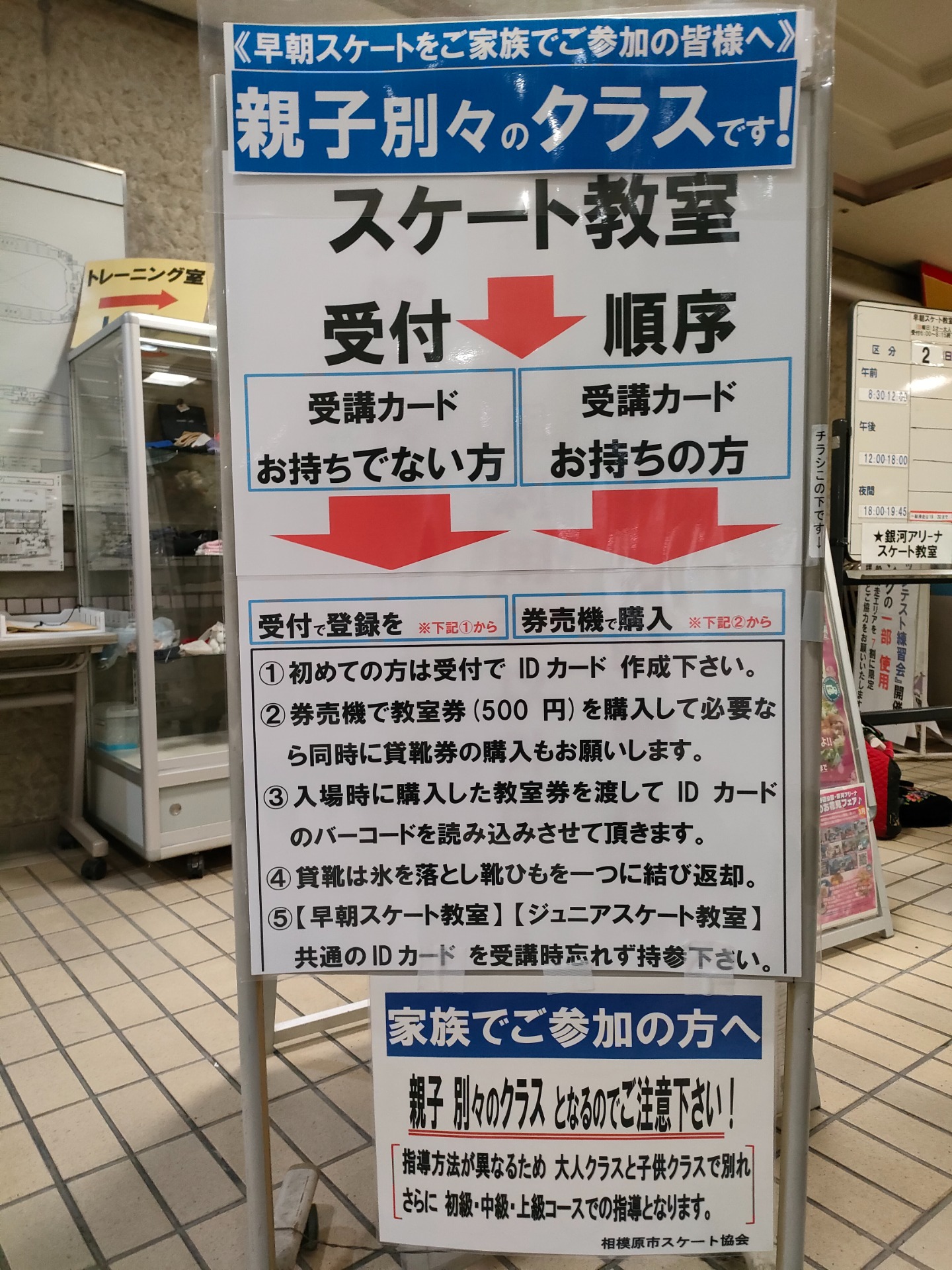 - 初めての方は、受付にてIDカード(受講票)の作成して下さい。受付後、券売機にて必要なチケット(教室券及び貸靴券)購入。※市内在住・在学の小・中学生も受講料等の料金はかかります。尚、付き添いの方の入場は無料。
